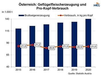 (AR) Der Wachstumstrend der österreichischen Geflügelfleischproduktion fand auch im Jahr 2020 keinen Abbruch. Im vergangenen Jahr belief sich die Bruttoeigenerzeugung laut Statistik Austria auf 143.948 t Schlachtgewicht. Das Ergebnis des Vorjahres wurde damit 2020 um 7,4 % übertroffen. Seit 2015...