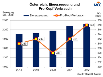 (MH) Statistik Austria veröffentlichte kürzlich die Versorgungsbilanz für den österreichischen Eiermarkt 2022. Demnach baute Österreich seine Eierproduktion 2022 erneut aus. Insgesamt wurden 2022 dort 2,38 Mrd. Eier erzeugt, das war ein Plus von 2,8 %. Ein Jahr zuvor wurden in Österreich 2,32 Mrd....