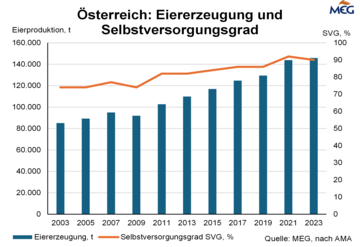 (MMB) In Österreich wurden im Jahr 2017 mehr Eier produziert und verbraucht als 2016. Die Erzeugung von Eiern insgesamt stieg um 4,1 % auf 1,960 Mrd. Eier. So teilte es die AMA (AgrarMarkt Austria) auf ihrer Website mit. Davon waren 120 Mio. Bruteier, die Erzeugung von Bruteiern stieg gegenüber...