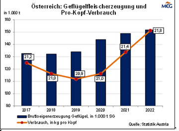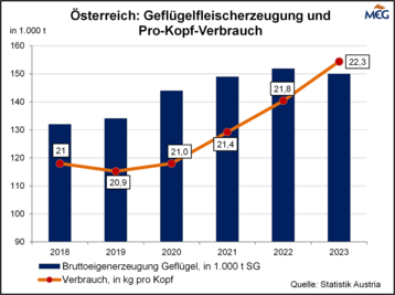 (MH) Die aktuellen Zahlen zur Versorgungsbilanz von Statistik Austria zeigen, dass die Geflügelfleischproduktion in Österreich erneut ausgebaut wurde. Im Jahr 2022 wurde demnach in Österreich eine Bruttoeigenerzeugung, das entspricht der Menge der gemästeten Tiere, von 151.871 t Geflügelfleisch...