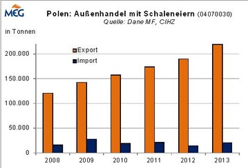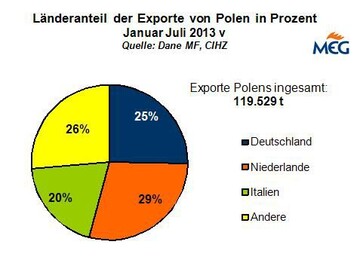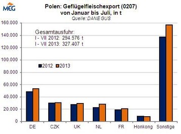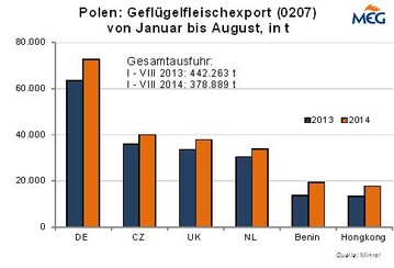 (ESK) Polen hat nach Angaben des polnischen Landwirtschaftsministeriums (Minrol) von Januar bis August 2014 etwa 422.263 t Geflügelfleisch exportiert. Das sind 17 % mehr als im gleichen Zeitraum 2013. Der wichtigste Empfänger war Deutschland mit 72.576 t, also 16 % der gesamten Exportmenge.