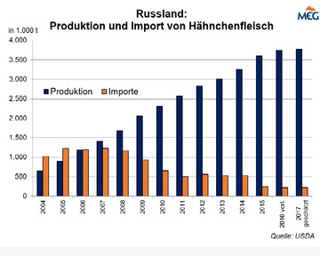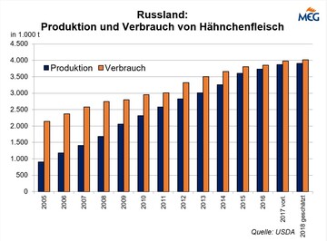 (MMB) Der russische Importbedarf an Hähnchenfleisch ist in den zurückliegenden Jahren weiter gesunken. Laut Informationen des US-amerikanischen Landwirtschaftsministeriums (USDA) erreichte die Hähnchenproduktion 2017 rund 3,87 Mio. t, der Konsum betrug im gleichen Jahr 3,98 Mio. t. Daraus...