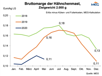 (MMB) Im ersten Quartal 2020 erhielten die Hähnchenmäster etwas höhere Auszahlungspreise für ihre Tiere. Trotz tendenziell anziehender Mischfutterpreise konnte sich die Bruttomarge leicht erhöhen.