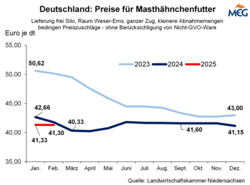 (MMB) Die Preise für Mischfutter sind in den vergangenen Monaten kräftig gestiegen. Ausgehend von der Hausse an den Märkten für Rohstoffe, verteuerte sich Mischfutter für Masthähnchen im Raum Weser- Ems (Lieferung frei Silo, ganzer Zug) nach Angaben der LWK Niedersachsen von Juli auf September um...