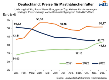 (MMB) Futter ist der größte Kostenfaktor bei der Geflügelmast. Daher lohnt sich von Zeit zu Zeit ein Blick auf die Preisentwicklung der Futterkomponenten.