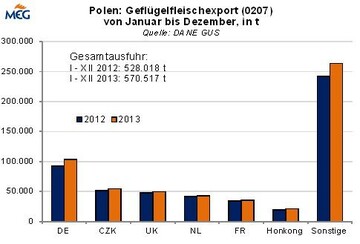 (MH) In Polen wird von Jahr zu Jahr mehr Geflügelfleisch erzeugt. In Schlachtbetrieben mit mehr als 50 Angestellten wurden 2013 laut dem polnischen Landwirtschaftministerium (Minrol) rund 1,83 Mio. t Geflügelfleisch produziert. Das waren gut 12 % mehr als 2012 und fast 31 % mehr als 2011. Die zu...