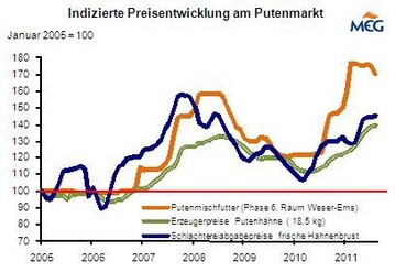 (MMB) Nebenstehende Grafik verdeutlicht die Entwicklung der Futter-, Erzeuger- und Großhandelspreise am deutschen Putenmarkt seit Januar 2005. Um die Daten in einer Grafik vergleichbar darstellen zu können, wurden die Preise indiziert, wobei Januar 2005 als 100 gesetzt wurde.Der Kurvenverlauf...