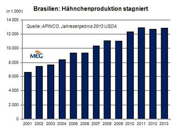 (MMB) Brasilien ist hinter den USA und China der größte Hähnchenproduzent der Erde. Die Zeiten des ungebremsten Wachstums sind am brasilianischen Markt allerdings erst mal vorbei. Mit 12,645 Mio. t produzierten Hähnchenfleischs wurden 2012 rund 2 % weniger erzeugt als 2011.