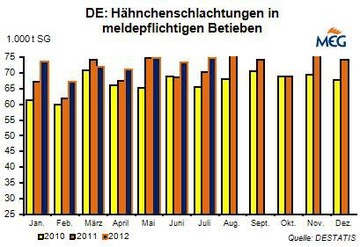 (MH) Laut Angaben des französischen Landwirtschaftministeriums (Agreste) wurden von Januar bis Februar 2013 rund 170.000 t Hähnchenfleisch in Frankreich produziert. Das waren 2,6 % mehr als im Vorjahreszeitraum. Seit 2005 hatte es einen stetigen Aufwärtstrend der Hähnchenschlachtungen gegeben....