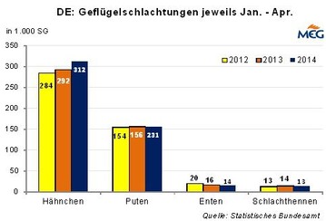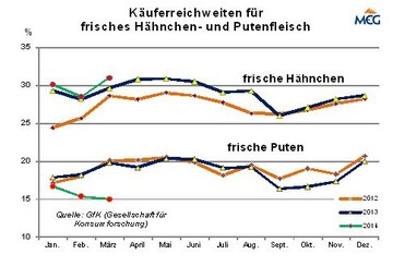(MMB) In den ersten drei Monaten des laufenden Jahres kauften die Haushalte in Deutschland insgesamt 109.484 t Geflügelfleisch, das waren 3,8 % weniger als im ersten Quartal 2013. Dies belegen die Ergebnisse des Haushaltspanels der Gesellschaft für Konsumforschung (GfK).