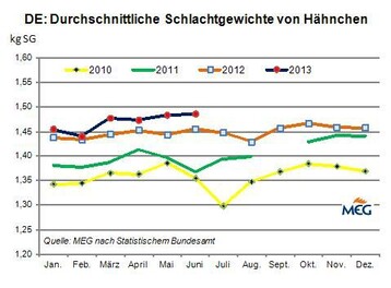 (MMB) Seit dem Jahr 2010 erfasst das Statistische Bundesamt neben der Schlachtmenge auch die Anzahl der geschlachteten Hähnchen. Daraus errechnete die MEG die durchschnittlichen Schlachtgewichte.