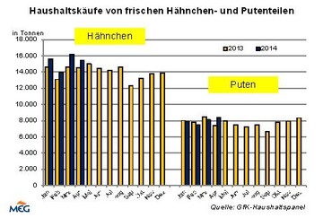 (MMB) Die von der GfK (Gesellschaft für Konsumforschung) ermittelten Haushaltskäufe von Geflügelfleisch beliefen sich im September 2014 auf 21.984 t, damit wurde das Vorjahresergebnis um 1,1 % verfehlt. Im Vergleich zum August 2014 legten die Haushaltskäufe sogar um 1,4 % zu.
