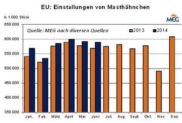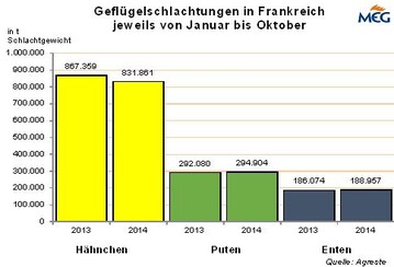 (ESK) Die Zahl der eingestallten Hähnchen- und Entenküken zur Mast ist im Laufe des Jahres 2014 gesunken, Putenküken mästeten die Franzosen dagegen verstärkt.