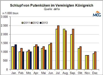 (MH) In den ersten fünf Monaten 2013 schlüpften im Vereinigten Königreich laut dem Department for Environment Food and Rural Affairs (defra) rund 400 Mio. Hähnchenküken, das waren 3,6 % mehr als im Vorjahreszeitraum. Mit Ausnahme von 2011 sind die Schlupfzahlen seit 2008 stetig gestiegen. Dies...
