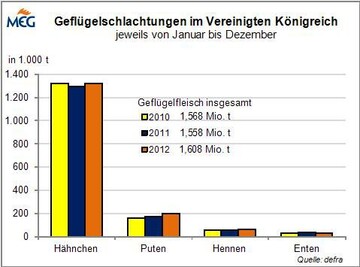 (MH) Laut den Kalkulationen des Department for Environment Food and Rural Affairs (defra), wurden im Vereinigten Königreich 2012 rund 1,608 Mio. t Geflügelfleisch erzeugt. Das waren 3 % mehr als im Vorjahr.