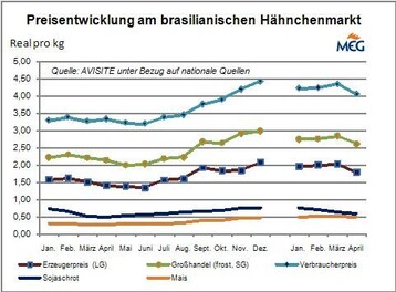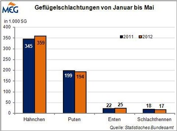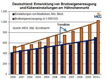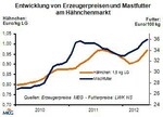 (MEG) Die Auszahlungspreise für Masthähnchen stiegen in den vergangenen Monaten an. Im Juni 2012 erhielten die Mäster für 1,5 kg schwere Tiere laut Erhebung der MEG (Marktinfo Eier & Geflügel) im Bundesschnitt 0,97 pro kg Lebendgewicht. Das waren 5 Cent pro kg mehr als noch zu Beginn des Jahres.