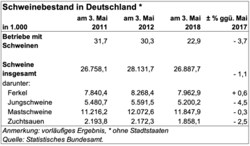 (Destatis) In Deutschland wurden zum Stichtag 3. Mai 2018 rund 26,9 Mio. Schweine gehalten. Wie das Statistische Bundesamt (Destatis) weiter mitteilt, ist die Anzahl der Schweine damit um rund 690 000 Tiere beziehungsweise 2,5 % gesunken, nachdem es im November 2017 einen Anstieg von 1,5 % gegeben...