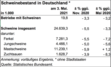(Destatis) Zum Stichtag 3. Mai 2021 wurden in Deutschland 24,6 Mio. Schweine gehalten. Wie Destatis mitteilt, ist die Zahl der Schweine nach vorläufigen Ergebnissen seit der Erhebung vom 3. November 2020 um 5,5 % oder 1,43 Mio. Tiere gesunken. Gegenüber dem 3. Mai 2020 ist der Bestand um 3,3 %...