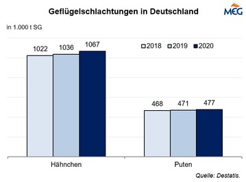 (MMB) Wie das Statistische Bundesamt kürzlich mitteilte, stiegen die Schlachtungen von Geflügel 2020 insgesamt um 1,9 % auf 1,61 Mio. t.