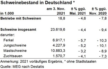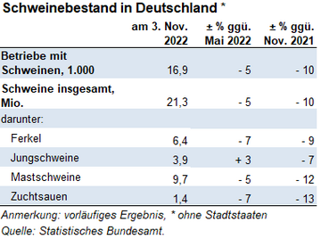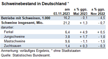 (Destatis) Zum Stichtag 3. November 2022 wurden in Deutschland nach vorläufigen Ergebnissen 21,3 Mio. Schweine gehalten. Wie das Statistische Bundesamt (Destatis) mitteilt, sank die Zahl der Schweine gegenüber der Viehbestandserhebung vom 3. Mai 2022 um 4,5 % oder 1,01 Mio. Tiere. Mit diesem...