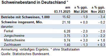 (Destatis) Zum Stichtag 3. November 2024 gab es in Deutschland 15.600 schweinehaltende Betriebe. Wie das Statistische Bundesamt (Destatis) nach vorläufigen Ergeb­nissen der Viehbestandserhebung mitteilt, nahm die Zahl der Betriebe damit im Vergleich zum 3. Mai 2024 um 1,0 % (-200 Betriebe) und im...