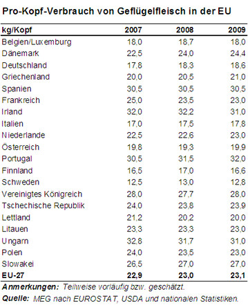 (MEG) Trotz immer schwächer werdender Datenbasis hat die MEG wieder die Pro-Kopf-Verbräuche für Geflügelfleisch in den einzelnen EU-Staaten kalkuliert. Dabei wird das EU-Mittel teils deutlich übertroffen, teils aber auch klar verfehlt. , zu unterschiedlich sind die Verbrauchergewohnheiten.