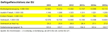 (MMB) Die EU bleibt Selbstversorger mit Geflügelfleisch. Einfuhren von 832.915 t Geflügelfleisch standen im Jahr 2014 Ausfuhren von 1.504.601 t gegenüber. Damit wuchsen die Ausfuhren gegenüber dem Jahr 2013 um 5,5 %. Die Einfuhren lagen 2,4 % über dem Vergleichsvolumen.